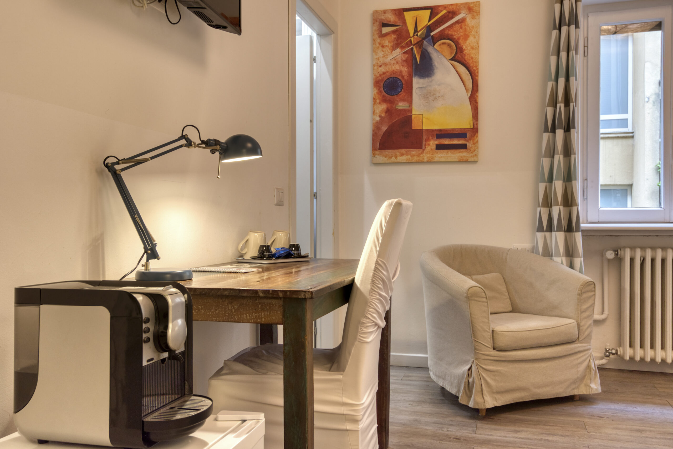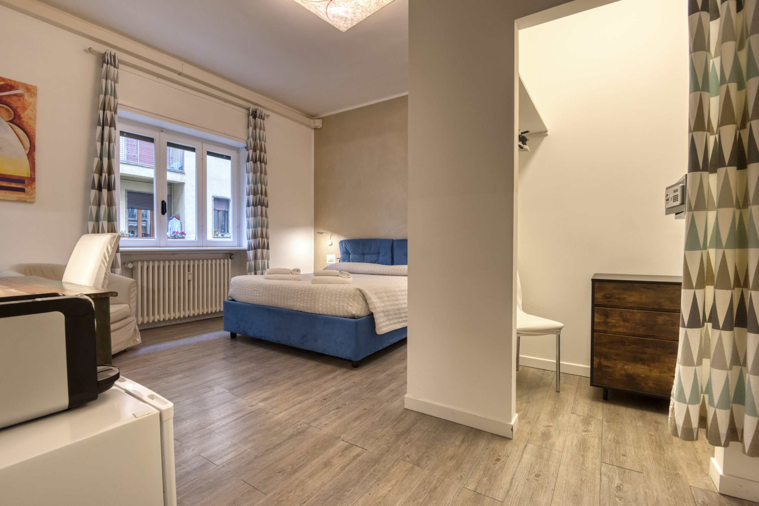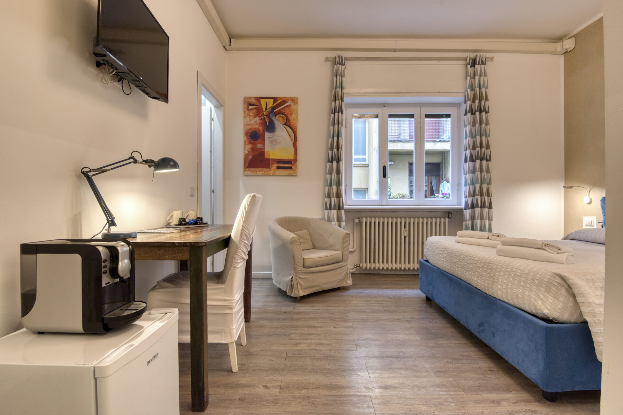 Camera spaziosa con letto matrimoniale, frigorifero, macchinetta del caffè, poltrona e bagno privato interno