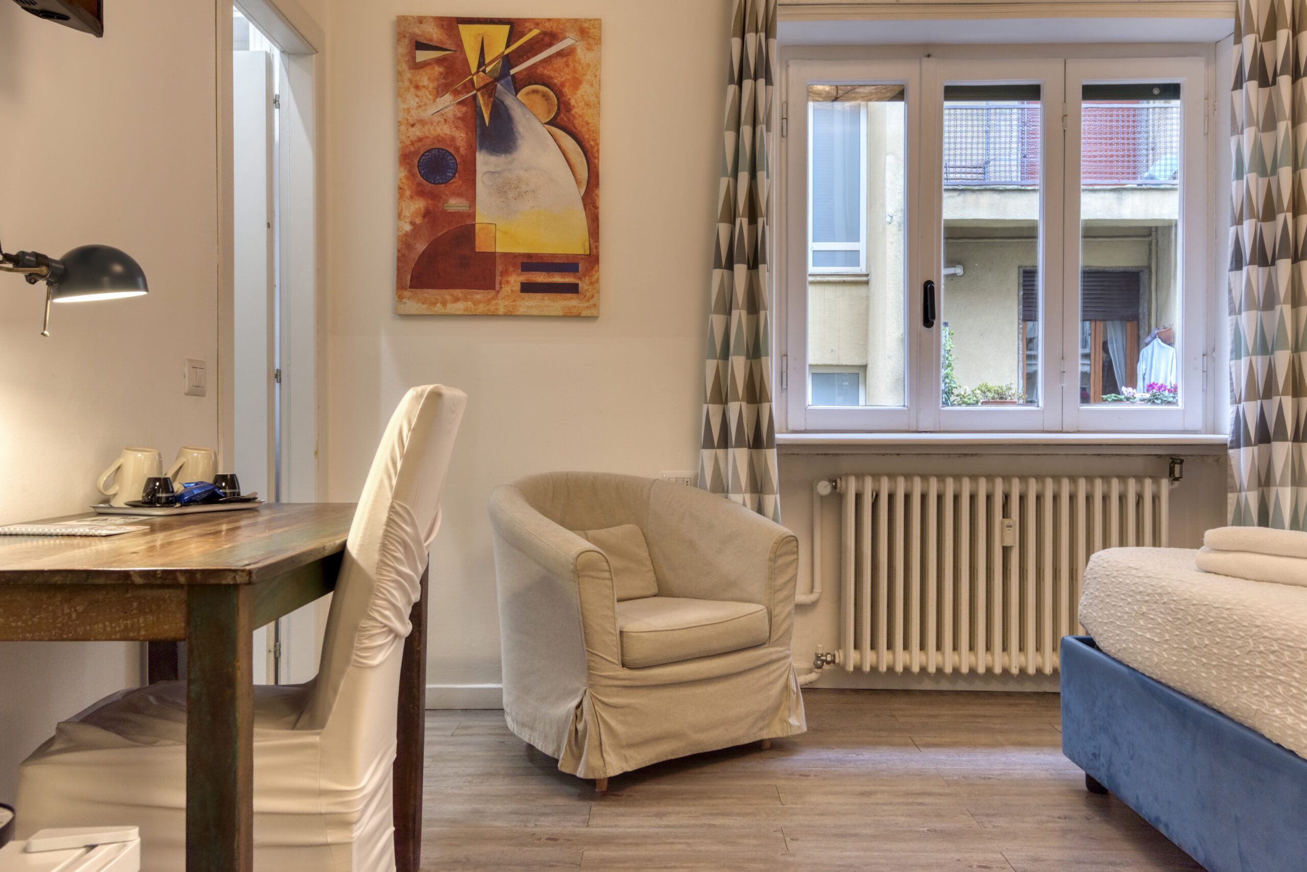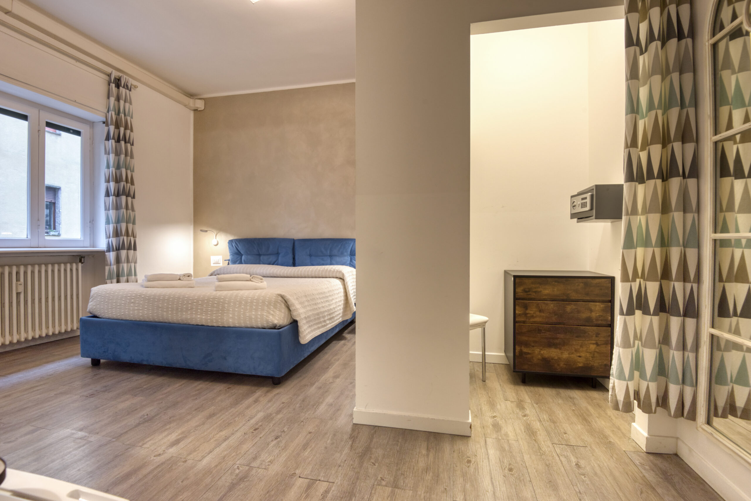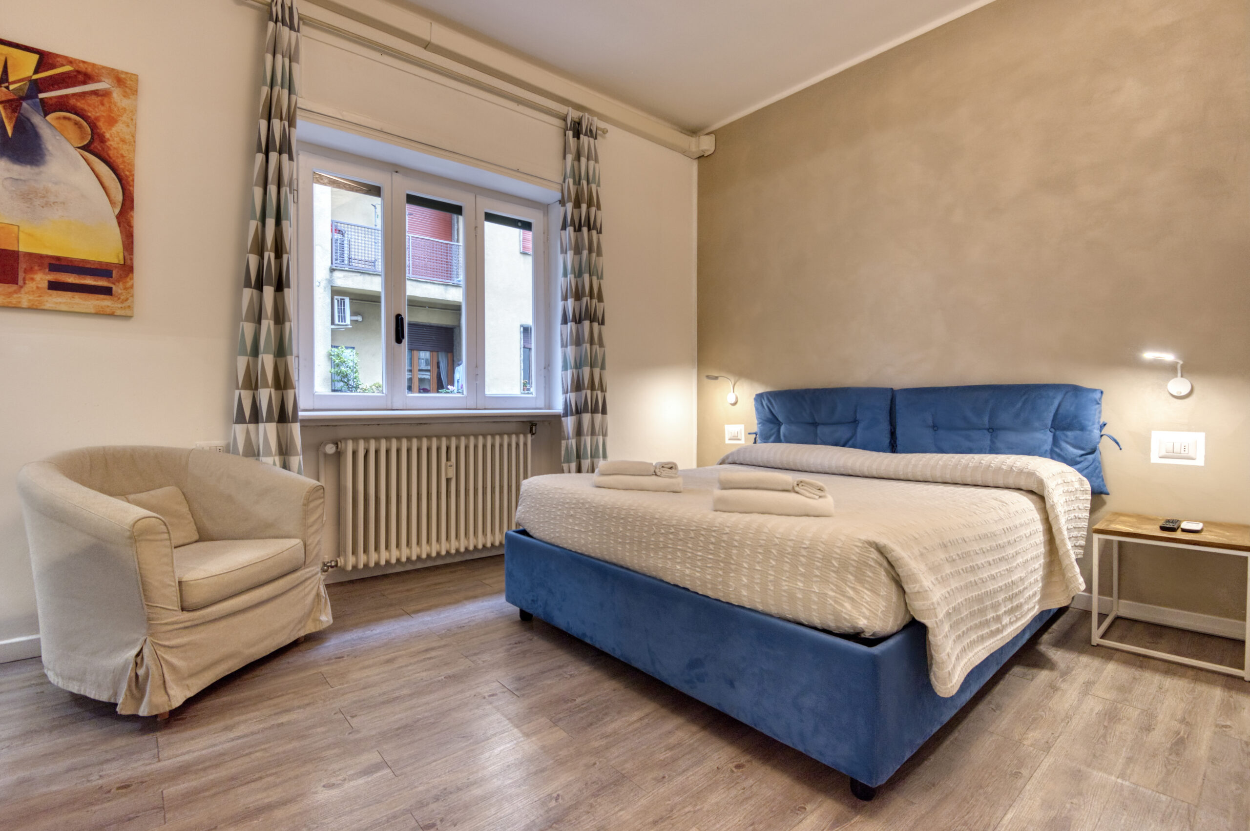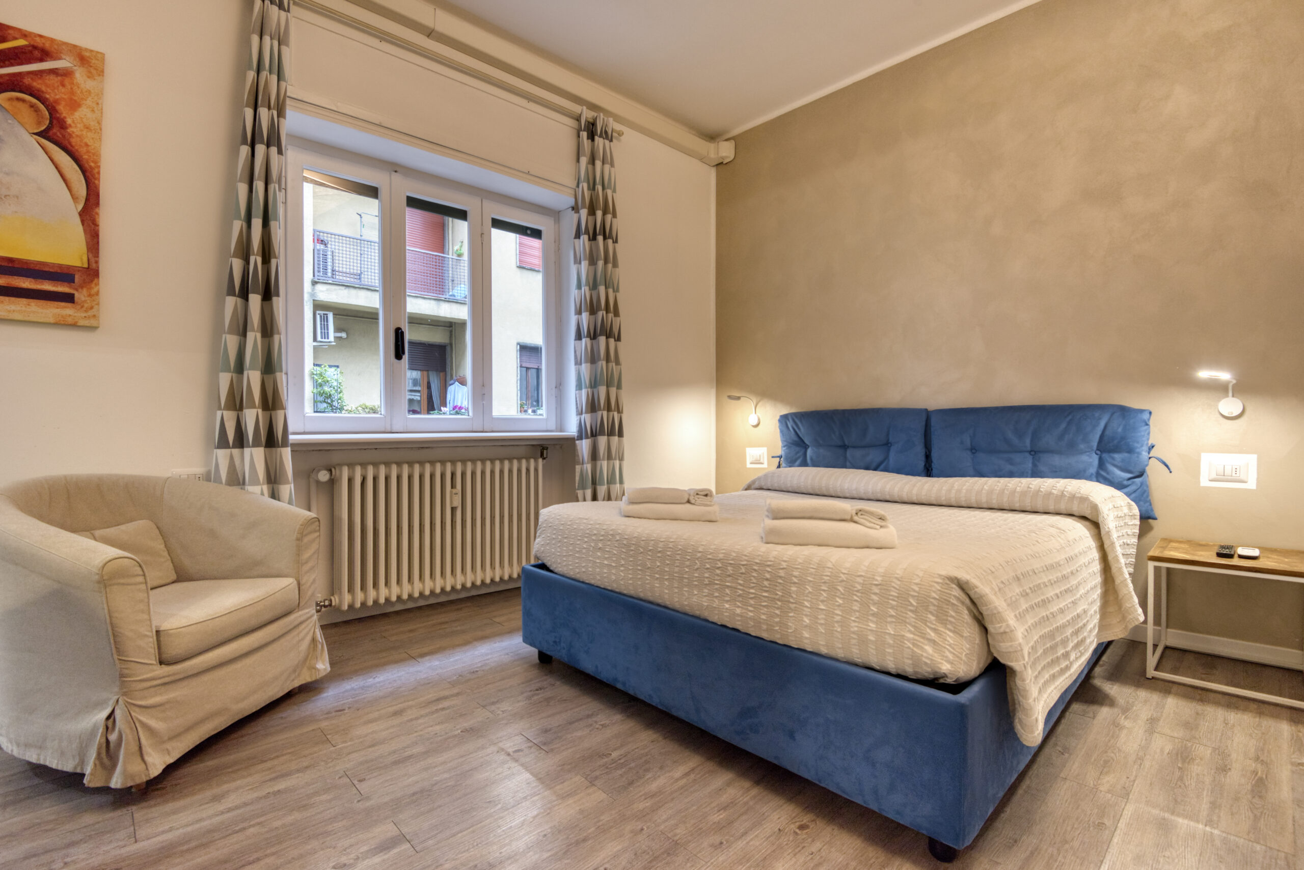 Camera spaziosa con letto matrimoniale, frigorifero, macchinetta del caffè, poltrona e bagno privato interno